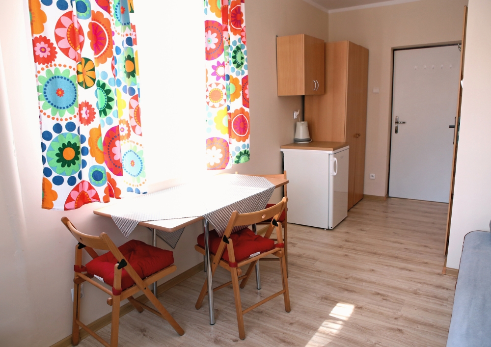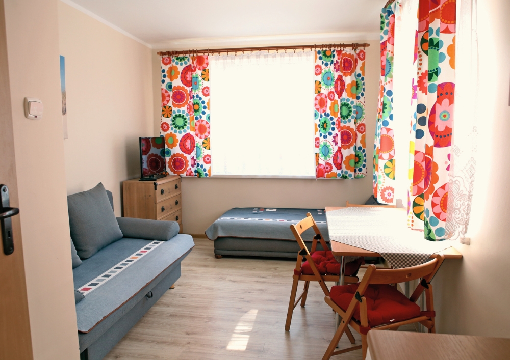Każdy pokój wyposażony jest w wygodną rozkładaną sofę (160×200) oraz tapczan, a także stół z krzesłami, szafę, telewizor, lodówkę, czajnik wraz z podręcznymi naczyniami i sztućcami. W pokoju znajduje się łazienka (WC, umywalka, prysznic).